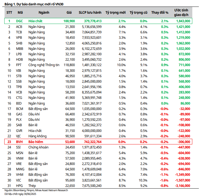 Theo dự báo của Chứng khoán Mirae Asset, cổ phiếu BVH không còn đủ điều kiện để có thể tiếp tục duy trì trong rổ VN30, do không còn đáp ứng được tiêu chí thanh khoản. Trong khi đó, với việc xếp ở vị trí thứ 29 về mặt vốn hóa (41,208 tỷ) và thỏa mãn toàn bộ các tiêu chí sàng lọc, DGC được cho rằng sẽ được thêm vào thay thế BVH trong chỉ số VN30.