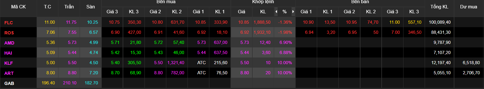 Đáng chú ý hơn, lúc 13h10, FLC và ROS bất ngờ khớp toàn bộ giá sàn để có thanh khoản trở lại. Hơn 63 triệu cổ phiếu FLC và 56 triệu cổ phiếu ROS giá sàn đã được mua khớp lệnh toàn bộ.