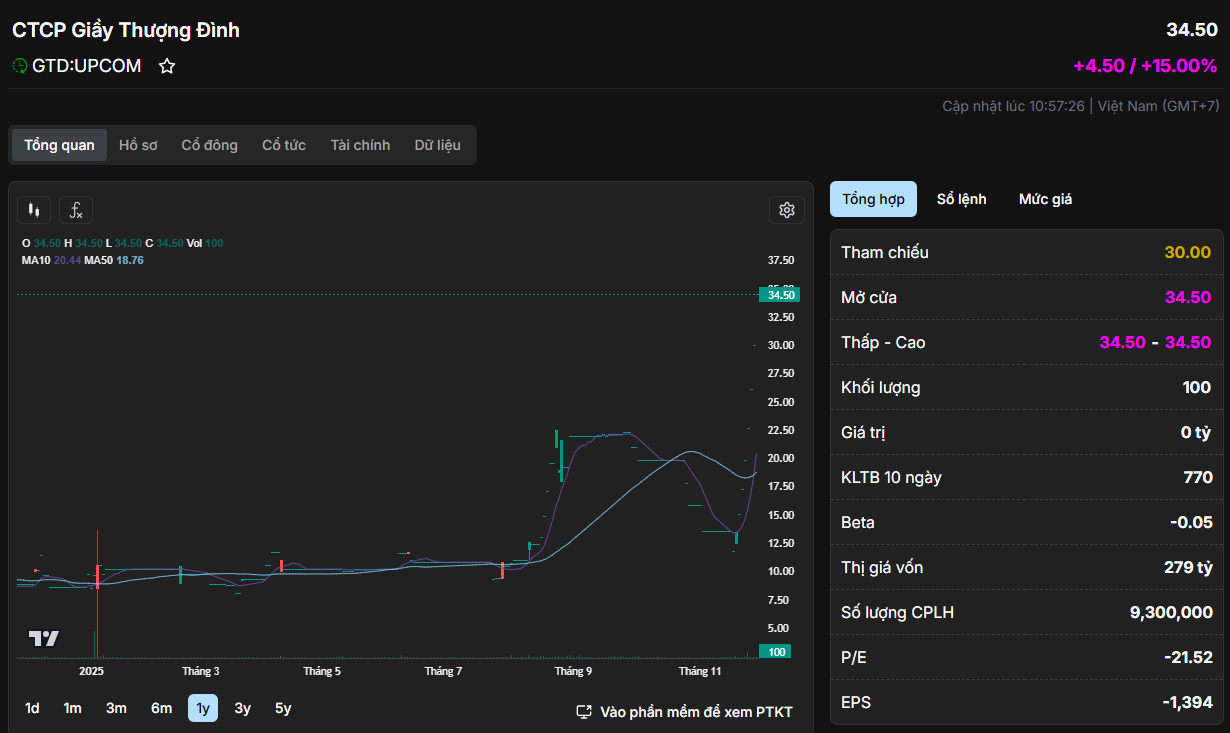 Cơn sóng tăng “nóng” của GTD khởi phát từ ngày 19/11 sau khi thông tin UBND TP Hà Nội dự kiến bán đấu giá toàn bộ hơn 6,38 triệu cổ phần, tương đương 68,67% vốn điều lệ của Giầy Thượng Đình, được công bố rộng rãi. Kể từ đó, GTD liên tục trải qua chuỗi ngày “tím bảng điện”, bất chấp thanh khoản rất thấp — bình quân chỉ vài trăm đến hơn 800 cổ phiếu/phiên.