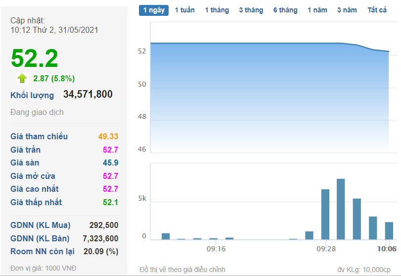 Lúc 9h30p ngày 31/5, cổ phiếu này đạt mức 52.200 đồng/cổ phiếu với khối lượng khớp lệnh hơn 22 triệu đơn vị. Riêng phiên ATO đã ghi nhận hơn 2 triệu cổ phiếu giao dịch ở giá trần 52.700 đồng/cổ phiếu.