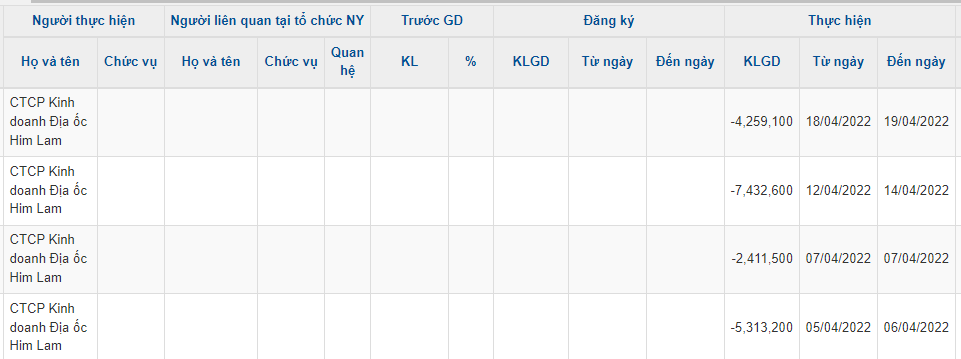 Sau giao dịch, Địa ốc Him Lam giảm tỷ lệ sở hữu từ 6.708% (33,53 triệu cp) xuống còn 5.856% (29,28 triệu cp). Giá trị giao dịch ước tính tối thiểu 280 tỷ đồng.