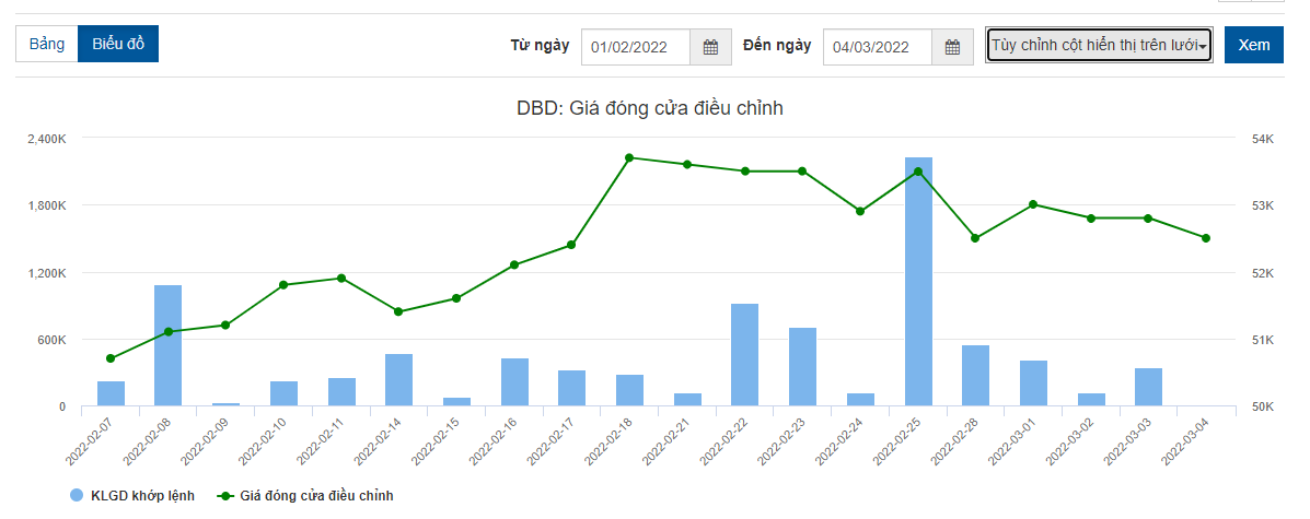 Đóng cửa phiên giao dịch ngày 3/3, cổ phiếu DBD đóng cửa giá tham chiếu 52.800 đồng/cổ phiếu.