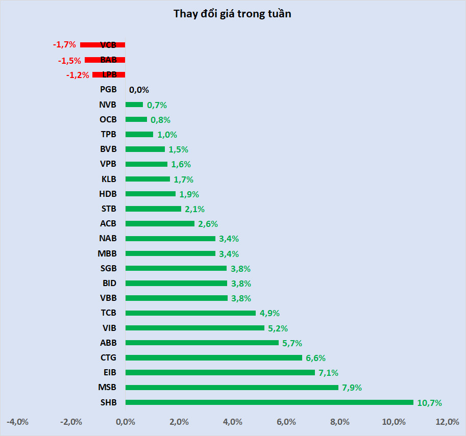 Ngược lại, chỉ có 3 mã ngân hàng giảm giá trong tuần với VCB giảm sâu nhất (-1,7%). Hai mã giảm giá còn lại gồm BAB (-1,5%) và LPB (-1,2%). Mã đứng giá duy nhất là PGB.