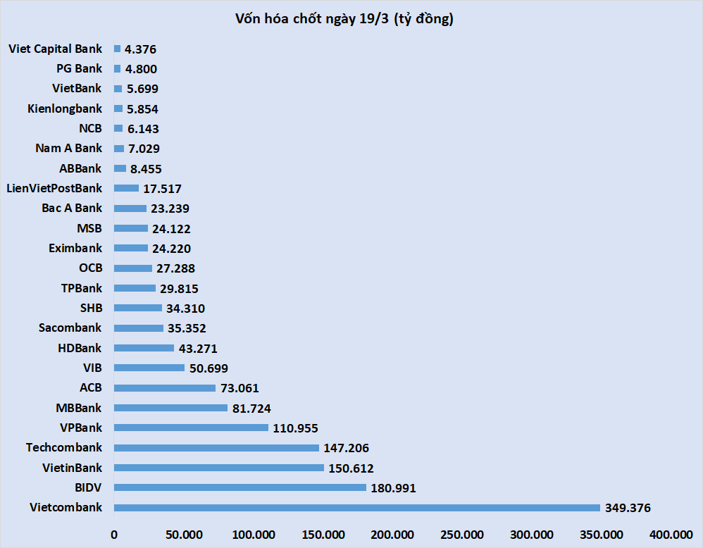 Đóng cửa ngày 19/3, giá trị vốn hóa của 25 ngân hàng niêm yết và giao dịch trên UPCoM dừng ở hơn 1,45 triệu tỷ đồng, tăng gần 35.000 tỷ so với mức chốt tuần trước, tương ứng tăng 2,47%.