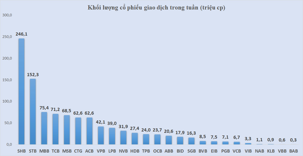 Ngoài SHB thì STB cũng duy trì thanh khoản ở mức cao trong tuần qua với hơn 152 triệu đơn vị. MBB, TCB và MSB lần lượt đứng kế sau với khối lượng giao dịch đạt 75,4 triệu, 71,2 triệu và 68,5 triệu đơn vị.