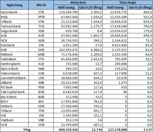 Ngoài STB, giao dịch thỏa thuận cũng diễn ra "nhộn nhịp" tại nhiều mã ngân hàng khác như MSB (hơn 21 triệu cp), VPB (gần 18,9 triệu cp), TCB (hơn 17,6 triệu cp), SGB (hơn 15,6 triệu cp), ACB (hơn 14,8 triệu cp),...