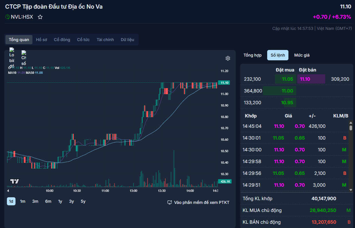 Phiên chiều ngày 14/3/2025, cổ phiếu NVL của CTCP Tập đoàn Đầu tư Địa ốc No Va (Novaland) bất ngờ đón dòng tiền nhập cuộc, đưa thị giá tăng kịch trần lên 11.100 đồng/cp.