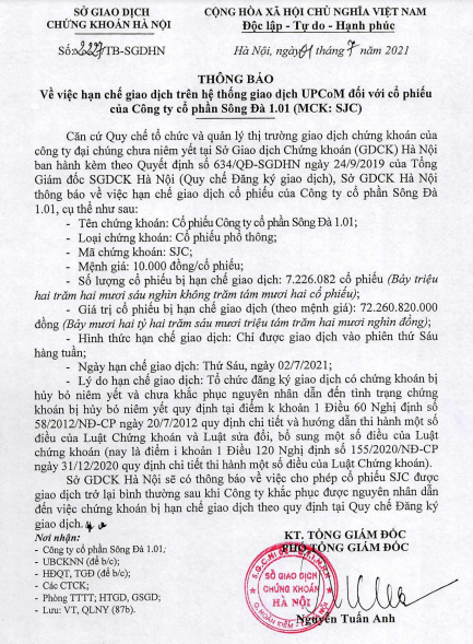 Sở GDCK Hà Nội (HNX) vừa có văn bản về việc hạn chế giao dịch đối với cổ phiếu SJC của CTCP Sông Đà 1.01.