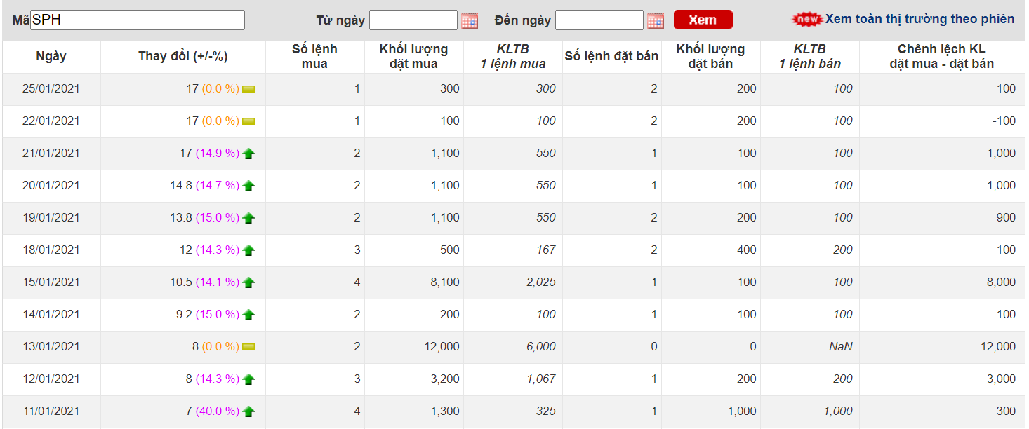 Trong 2 tuần trở lại đây, cổ phiếu SPH của Xuất nhập khẩu Thủy sản Hà Nội có 8 phiên tăng kịch trần nhưng thanh khoản cổ phiếu chỉ 100-200 đơn vị, cá biệt phiên 11/1 có 1.000 đơn vị được giao dịch.