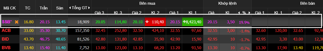 Đáng chú ý, tại thời điểm này, cổ phiếu SSB ghi nhận dư mua trần hơn 8,4 triệu cổ phiếu, trong khi ở chiều ngược lại đã trắng bên bán.