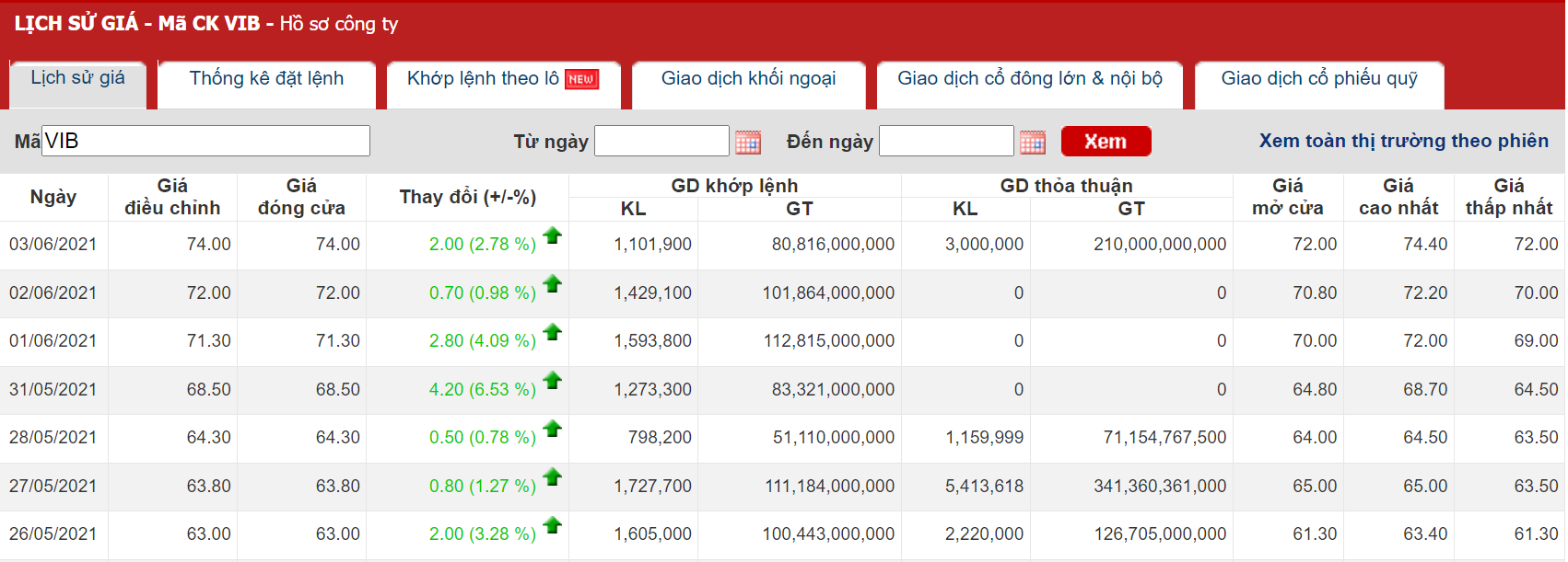 Được biết, cổ phiếu VIB tăng 7 phiên liên tiếp từ mức 61.000 lên 74.000 đồng/cổ phiếu, tăng tới 13.000 đồng (tương đương tăng 19,71%). Phiên giao dịch sáng 4/6 (lúc 11h16p), cổ phiếu VIB tiếp tục tăng thêm 200 đồng lên mức 74.200 đồng/cổ phiếu.