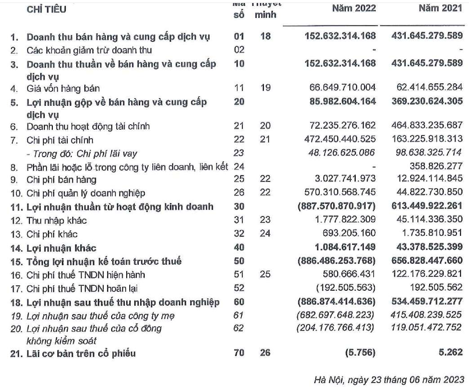 Theo BCTC hợp nhất năm 2022 đã được kiểm toán, LNST chưa phân phân phối tại ngày 31/12/2022 âm gần 234 tỷ đồng. Năm 2022, Công ty lỗ ròng gần 683 tỷ đồng.
