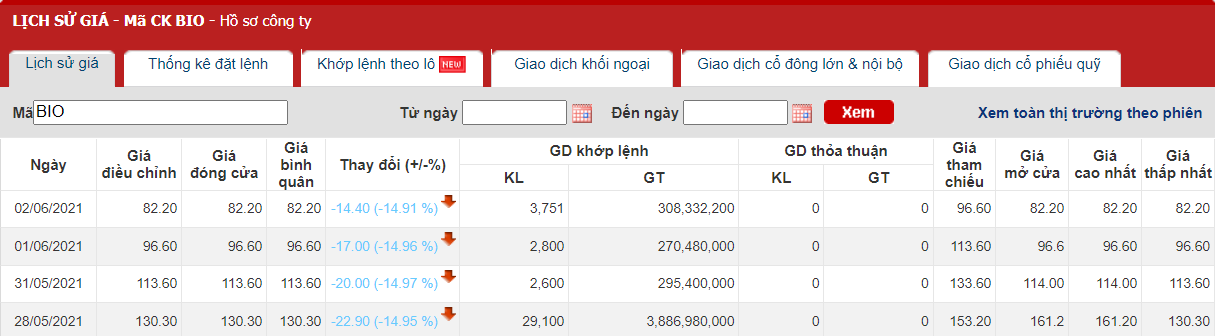 Dữ liệu giao dịch cổ phiếu BIO kể từ tháng 4/2021.