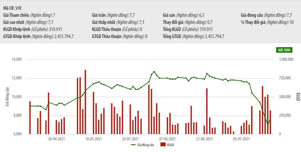 Ngay sau thông tin trên, cổ phiếu VHE bất ngờ tăng kịch trần 10% và đứng ở mức 7.700 đồng/cổ phiếu, khối lượng khớp lệnh đạt 2,451,794,700 đơn vị.