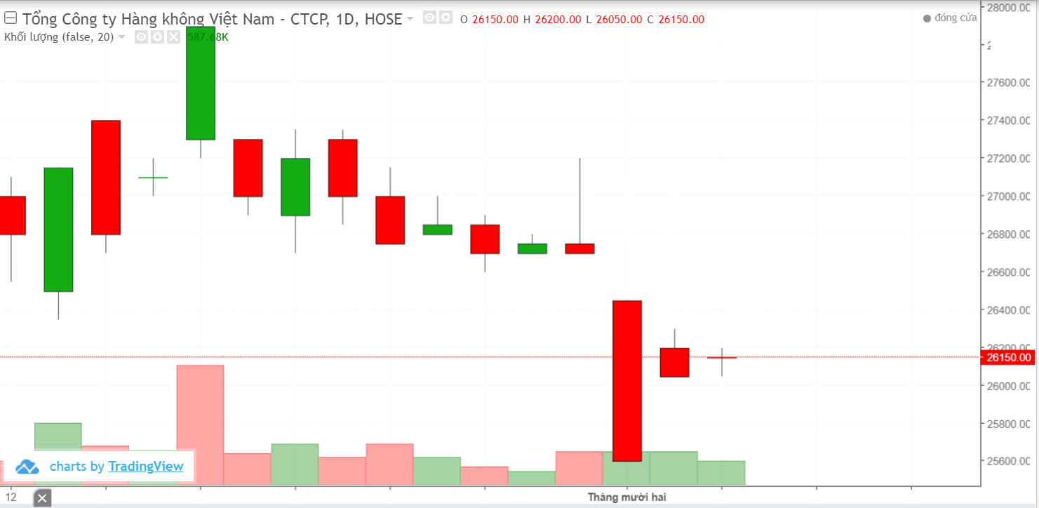 Tính đến cuối phiên giao dịch ngày 3/12, đã là phiên thứ 4 liên tiếp cổ phiếu HVN  Tổng Công ty Hàng không Việt Nam Vietnam Airlines rớt giá. Chốt phiên giao dịch chiều nay (03/12), cổ phiếu HVN của Vietnam Airlines tiếp tục mất thêm 0,19% còn 26.150 đồng.