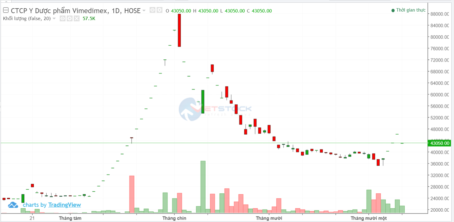 Chỉ sau chưa đầy 1 tháng, cổ phiếu VMD tăng mạnh vùng giá 24.700 đồng/cp lên mức đỉnh 82.400 đồng/cp sau đó là chuỗi giảm rất sâu về mức 34.800 đồng/cổ phiếu vào cuối phiên 3/11 và mới chỉ bật tăng trở lại trong 4 phiên gần đây.