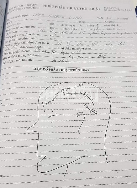 Trao đổi với PV Tuổi trẻ và Pháp luật về trường hợp của anh Vinh, đại diện Bệnh viện Đa khoa tỉnh Hưng Yên cho biết, việc giám định thương tật không thuộc chuyên môn, trách nhiệm của bệnh viện. Nhìn vào bệnh án, bác sĩ đánh giá: Những vết khâu, khả năng là mổ sọ não hoặc rách da; Nội dung được ghi ở đây là bệnh nhân này được khâu vết thương, lóc da đầu phức tạp, sử dụng tiền gây mê.
