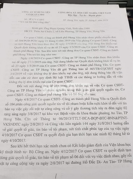 Văn bản trả lời của Cơ quan Cảnh sát điều tra Công an TP Hưng Yên