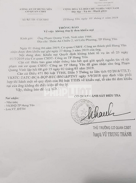 Đến ngày 6/4/2019, anh Vinh nhận được Thông báo số 465/TB- CQCSĐT về việc không thụ lý đơn khiếu nại của Cơ quan cảnh sát điều tra Công an TP Hưng Yên.
