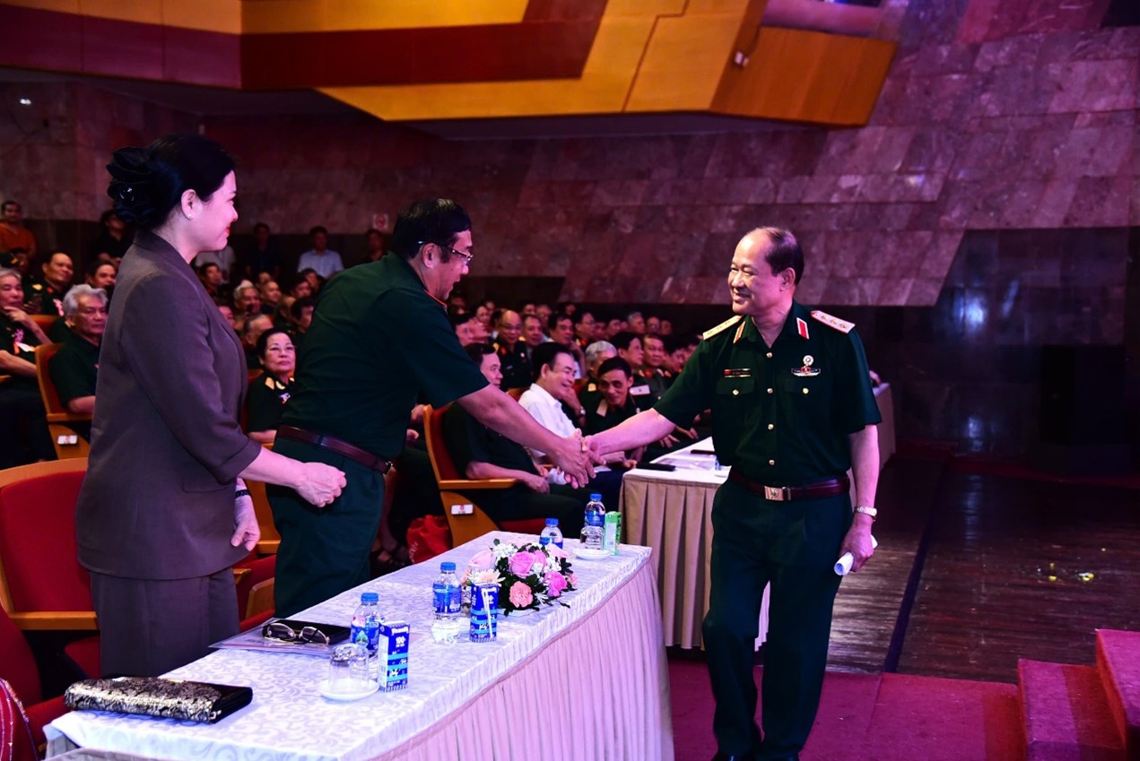 Thượng tướng Bế Xuân Trường – Phó Chủ tịch MTTQ Việt Nam, Chủ tịch Hội Cựu chiến binh Việt Nam bắt tay cảm ơn các đồng chí lãnh đạo Trung ương, các Bộ ban ngành… tới tham dự Chương trình giao lưu nghệ thuật “Còn mãi với thời gian”.