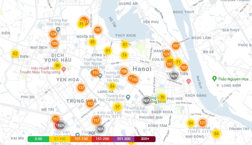 Theo ghi nhận, tại Hà Nội rất nhiều điểm màu vàng AQI thấp hơn 100. Cụ thể, ghi nhận từ ứng dụng online Pam Air vàosáng nay cho thấy, chỉ số chất lượng không khí đã giảm xuống ở ngưỡng “màu vàng,” phổ biến từ 51 - 100. Ở ngưỡng này, chất lượng không khí được xác định là trung bình.