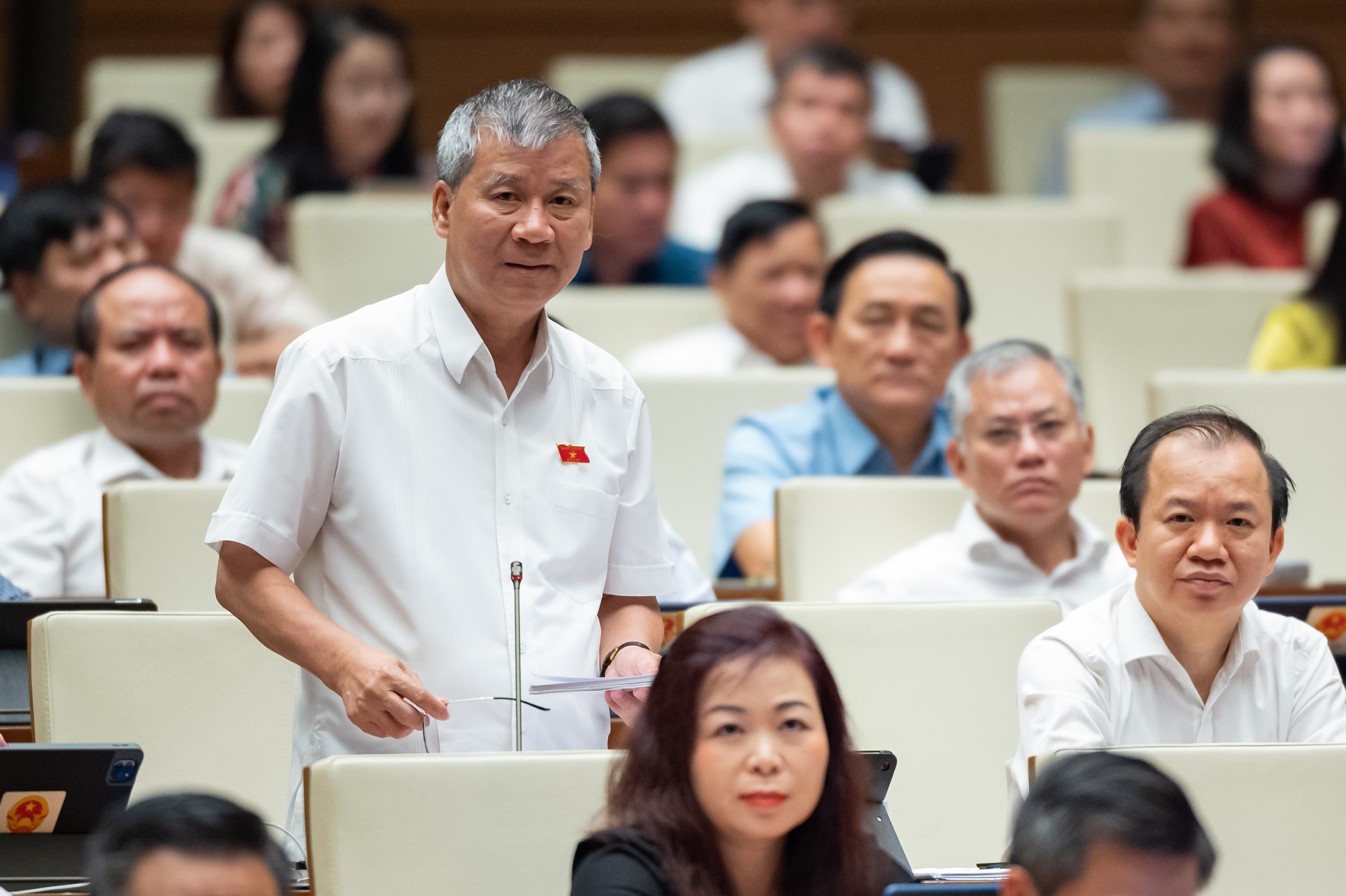 Phát biểu tranh luận, đại biểu Nguyễn Minh Sơn (đoàn Tiền Giang) phản ánh tình trạng tăng công suất khai thác tại các mỏ cát khi triển khai dự án có thể gây sụt lún, ảnh hưởng đến môi trường. Đại biểu đề nghị Bộ trưởng Nguyễn Văn Thắng làm rõ các giải pháp xử lý.