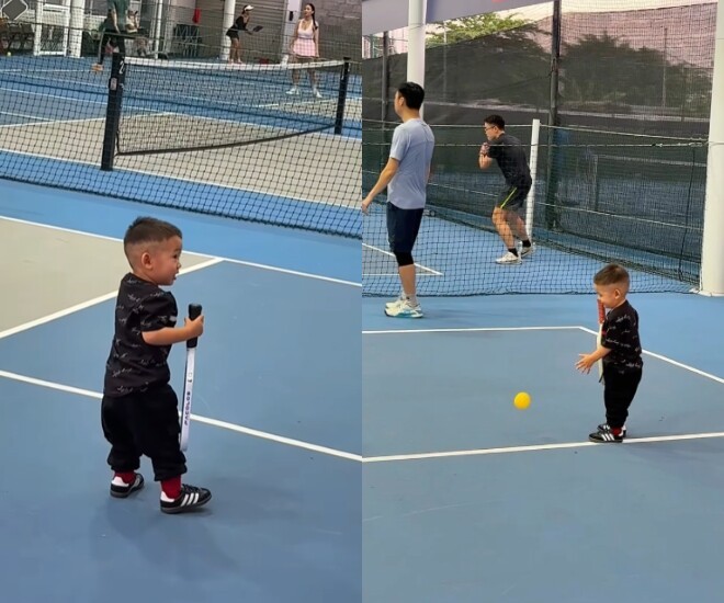 Mới đây, Minh Hằng đã chia sẻ đoạn video cùng ông xã doanh nhân đưa quý tử đầu lòng đi chơi pickleball. Outfit ra sân của quý tử mới 2 tuổi cũng khiến nhiều người trầm trồ.