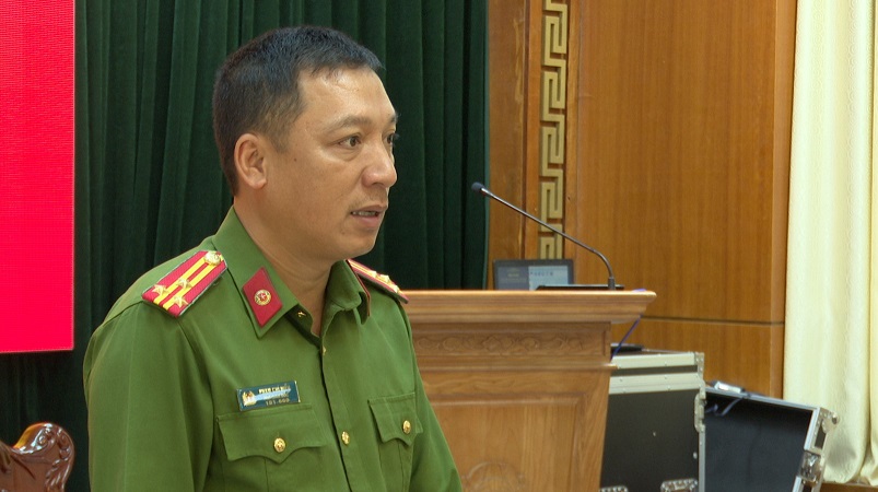 Thượng tá Phạm Chí Hiếu, Phó Giám đốc Công an tỉnh phát biểu tại hội nghị