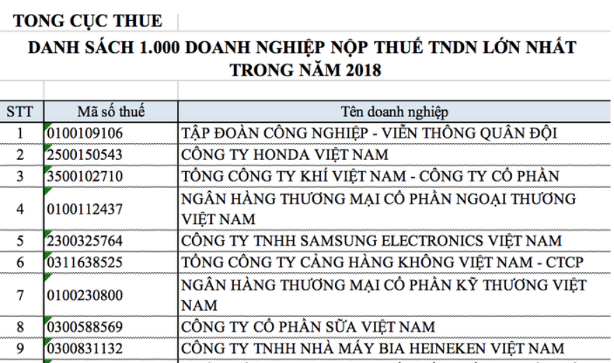 Tổng cục Thuế vừa công khai danh sách xếp hạng 1.000 doanh nghiệp nộp thuế thu nhập doanh nghiệp (V1000) lớn nhất Việt Nam năm 2018.