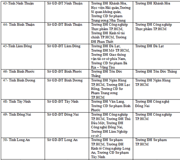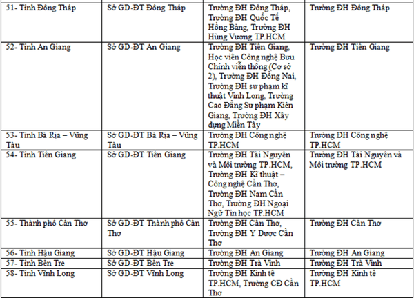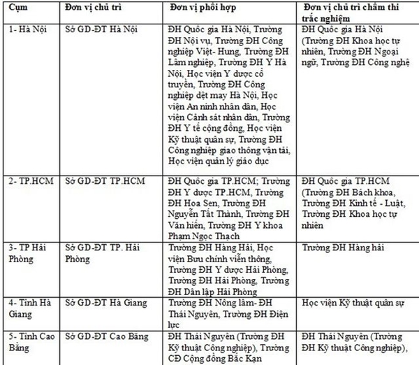 Tại mỗi cụm thi, Bộ GD&ĐT cũng quy định các đơn vị chủ trì chấm môn thi trắc nghiệm. Riêng ở Bạc Liêu do ghép Sở nên Bộ giao Sở GD&ĐT và Sở khoa học công nghệ chủ trì cụm thi đã quy định. Cụm thi số 50 tại tỉnh Đồng Nai do Sở GD&ĐT Tây Ninh chủ trì.
