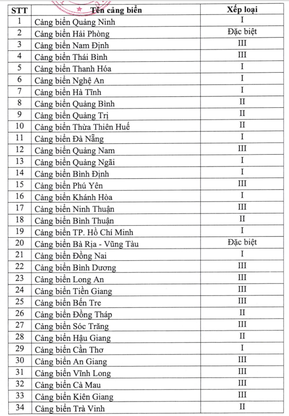 Theo danh mục, trong 34 cảng biển Việt Nam có 2 cảng biển loại đặc biệt là cảng biển Hải Phòng và cảng biển Bà Rịa - Vũng Tàu.