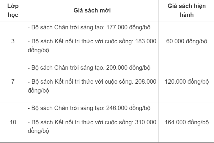 Thông tin từ Nhà xuất bản Giáo dục Việt Nam, nhà xuất bản đã thực hiện kê khai giá bán lẻ các bộ SGK lớp 3, lớp 7, lớp 10 với Cục Quản lí Giá - Bộ Tài chính theo đúng quy định. Các bộ SGK của nhà xuất bản có giá bìa cụ thể như sau: