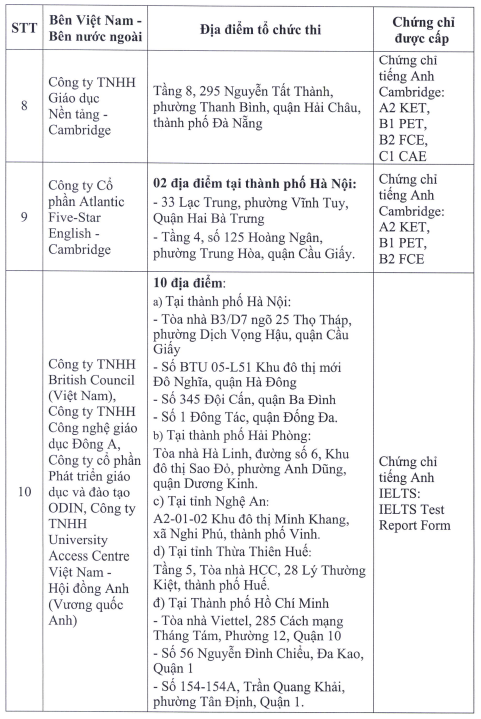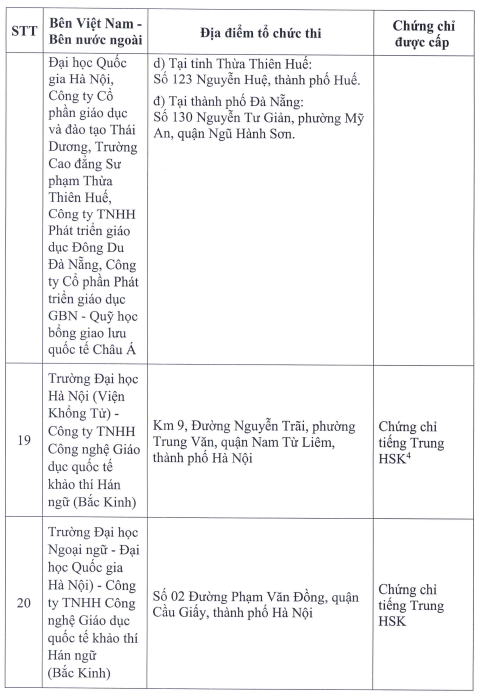 Cụ thể, danh sách 23 đơn vị được liên kết thi, cấp chứng chỉ năng lực ngoại ngữ như sau: