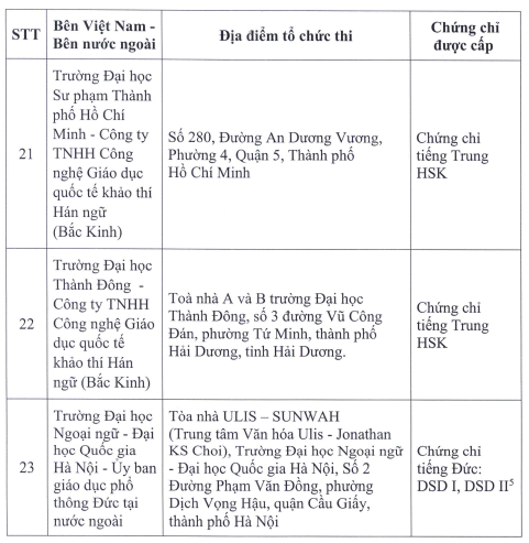 Đến ngày 7/2/2023 đã có 23 đơn vị đã được Bộ phê duyệt liên kết tổ chức thi, cấp chứng chỉ năng lực ngoại ngữ của nước ngoài.