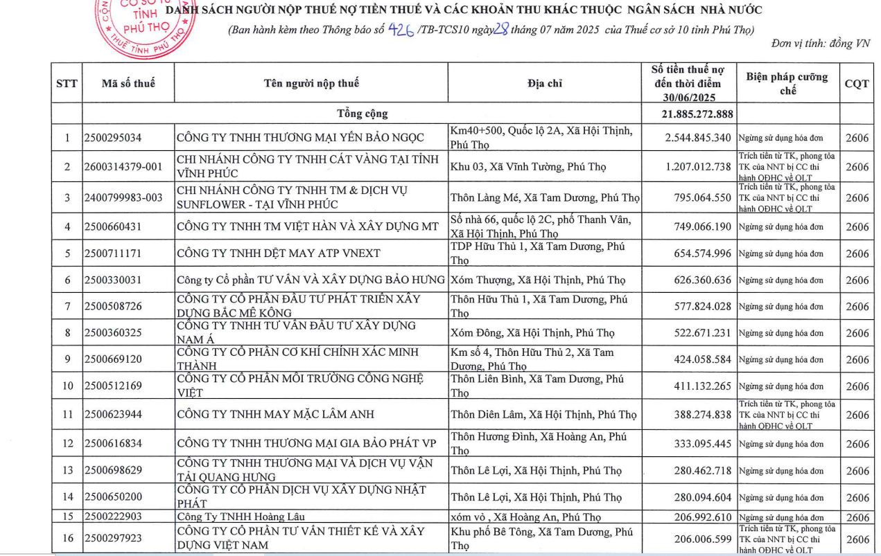Thuế cơ sở 10 tỉnh Phú Thọ vừa công bố danh sách 50 doanh nghiệp nợ thuế tính đến hết tháng 6/2025
