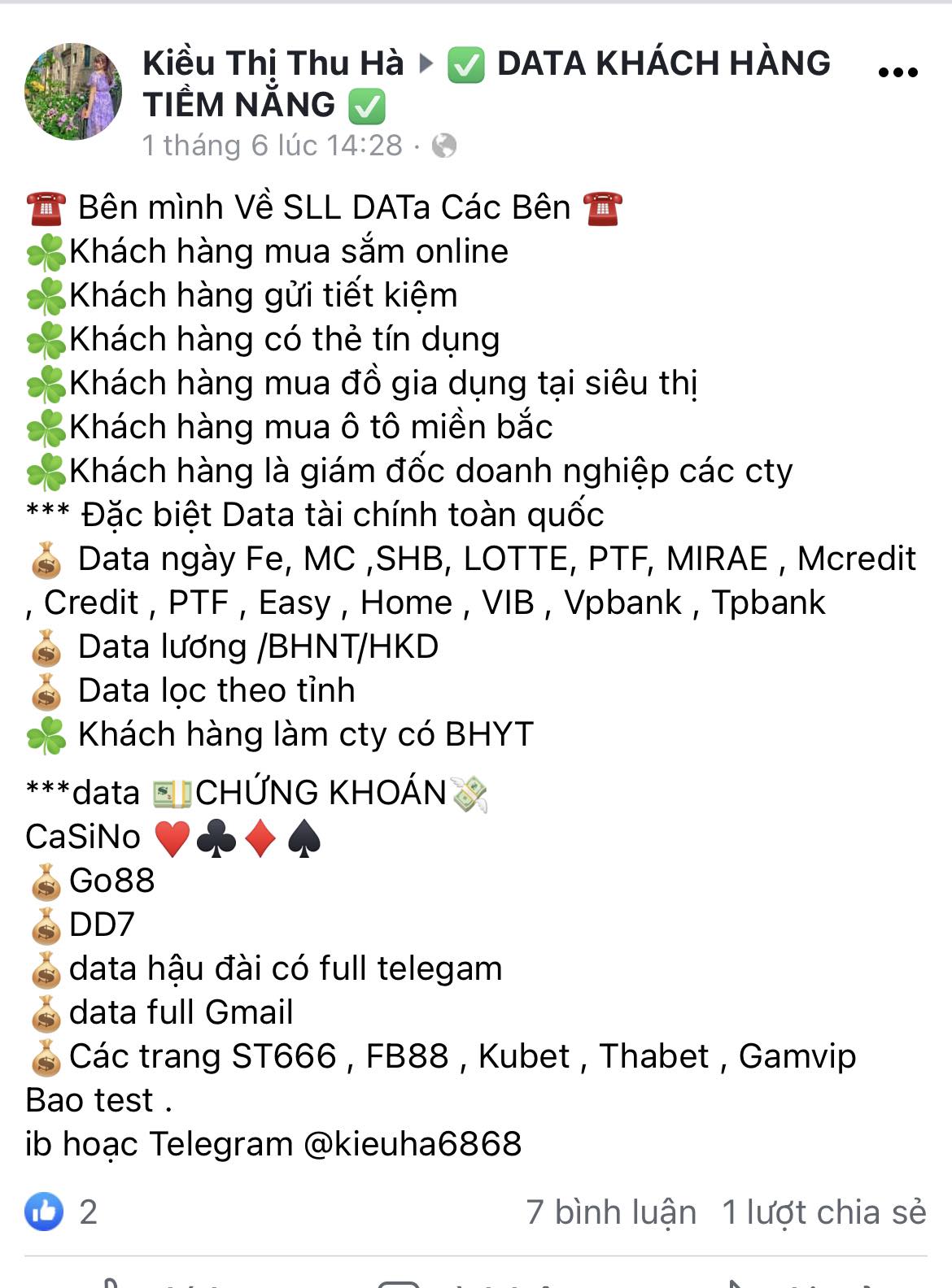 Tại các nhóm này, hằng ngày sẽ có cả chục bài viết rao bán danh sách thông tin, dữ liệu cá nhân như: “Khách hàng mua chung cư cao cấp Hà Nội và TP. Hồ Chí Minh”, “Khách mua tại các cửa hàng thời trang”, “Khách đến thẩm mỹ viện”, “Khách là phụ huynh có con học cấp 3”… Giá cho mỗi giao dịch mua bán data trung bình chỉ vài trăm nghìn đồng. Con số sẽ tăng giảm tuỳ theo nhu cầu, số lượng. Nhưng về cơ bản là “rẻ như bèo”.