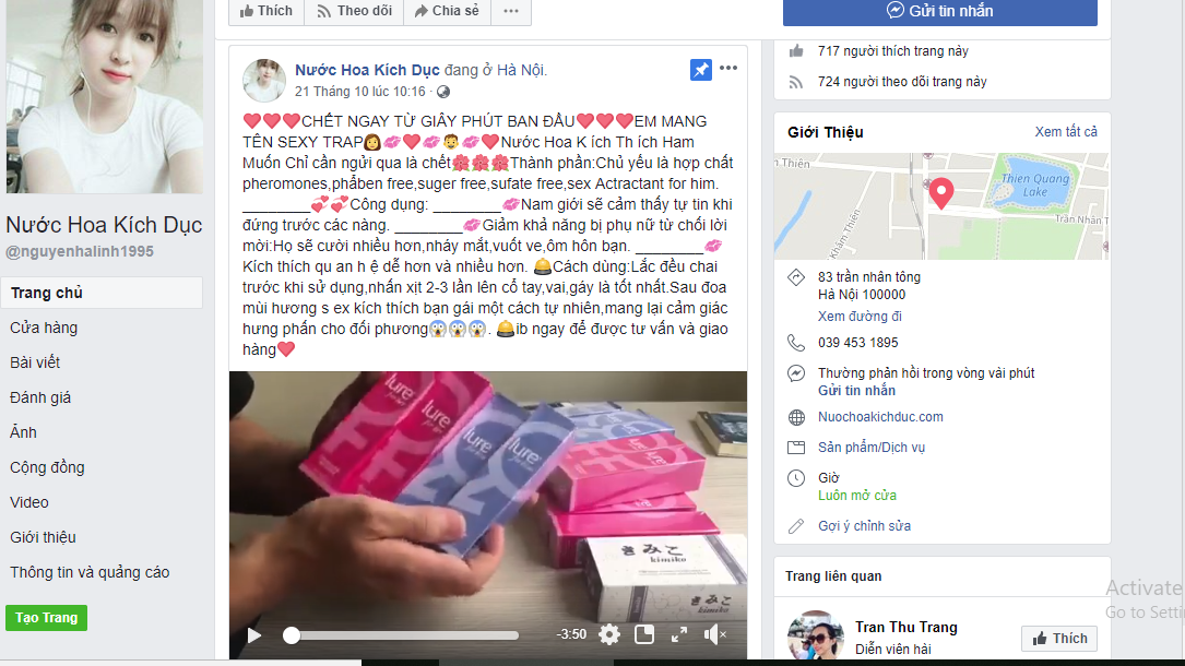 Liên hệ với một người bán hàng online khác trên facebook, PV cũng nhận được những lời mời chào khác không kém phần hấp dẫn. Ngoài việc đăng bài trên fanpage, nhiều người không ngần ngại livetream quảng cáo sản phẩm này. Người bán khẳng định nước hoa kích dục phát huy công dụng chỉ sau thời gian rất ngắn, đảm bảo khiến đối phương khi hít phải không thể cưỡng lại được.