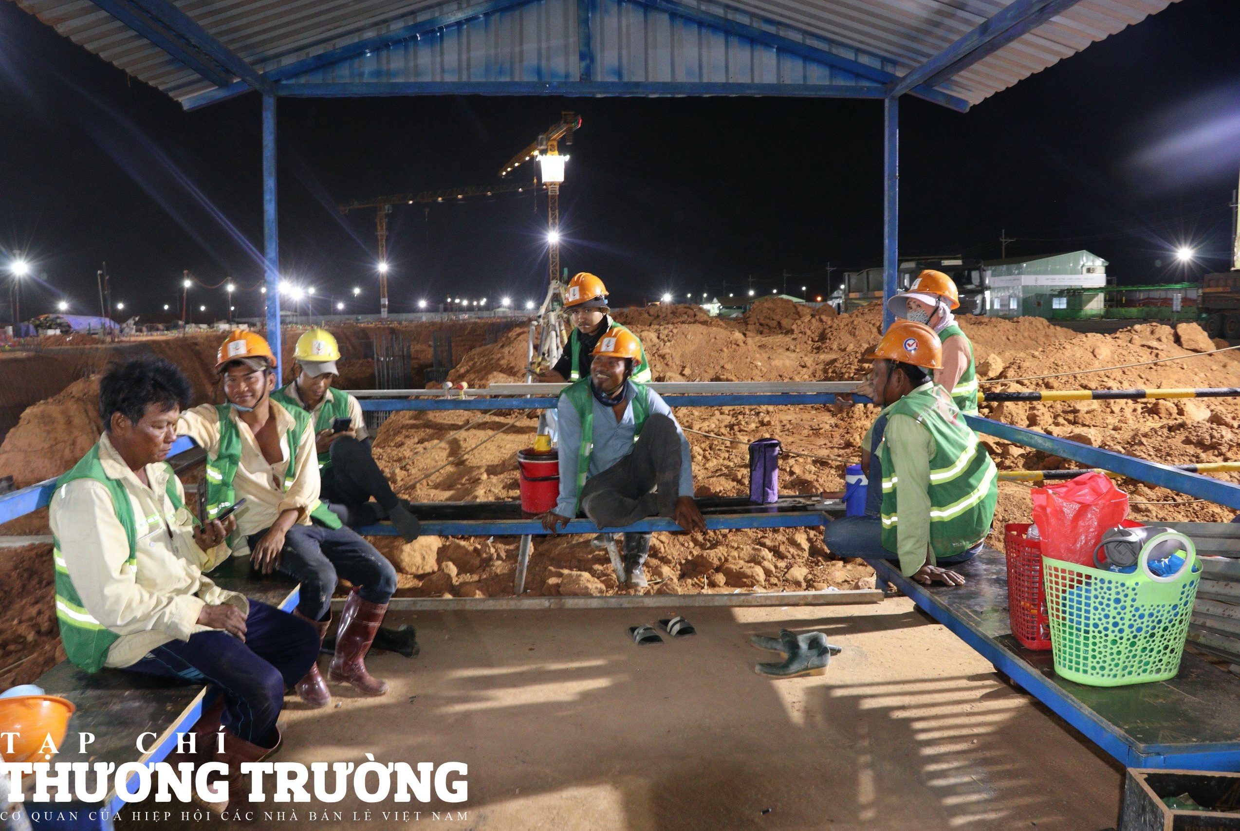 Công nhân tạm nghỉ khi trời đã về khuya.