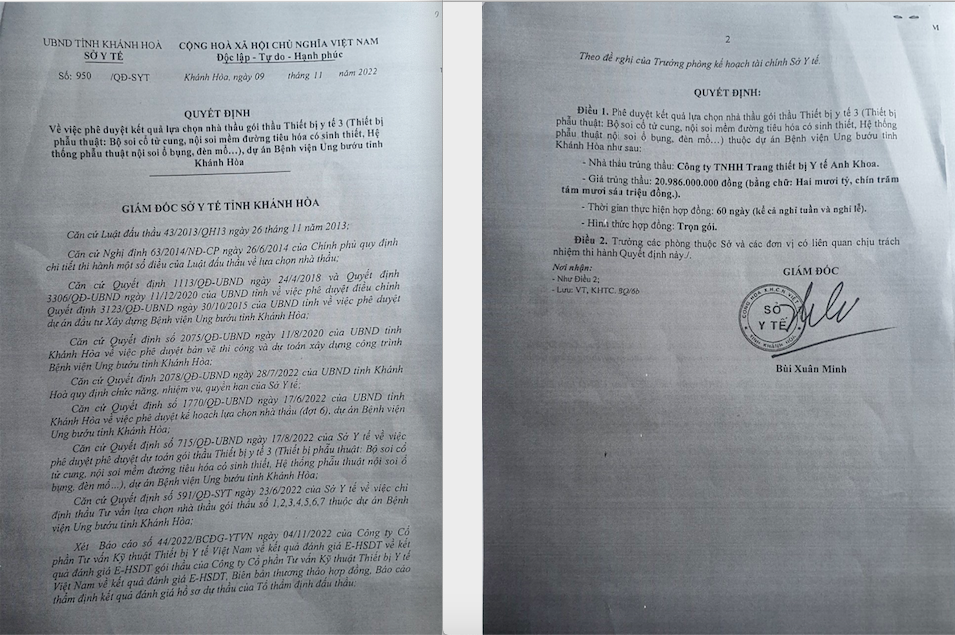 Ngoài gói thầu gần 21 tỷ đồng nói trên, vào ngày 18/5/2021, ông Bùi Xuân Minh, Giám đốc Sở Y tế tỉnh Khánh Hòa cũng phê duyệt cho Công ty Anh Khoa trúng gói thầu “Mua sắm trang thiết bị y tế năm 2021” có giá trúng là 17.602.000.000 đồng.