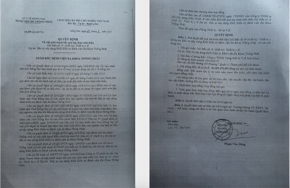 13 ngày sau, (ngày 21/6/2021), cũng chính ông Phạm Văn Dũng, Giám đốc Bệnh viện Đa khoa Thống Nhất (Đồng Nai) ký Quyết định số 104/QĐ-BVTN để phê duyệt cho Công ty Anh Khoa trúng “Gói thầu số 14 (thiết bị): Thiết bị y tế", với giá trúng thầu là 46.355.475.000 đồng.