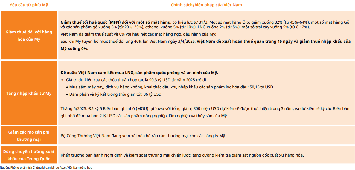 Thỏa thuận hiện tại cũng chưa đề cập đến các hàng rào phi thuế quan (NTBs) mà Hoa Kỳ cáo buộc Việt Nam đang áp đặt lên hàng hóa nhập khẩu của Mỹ. Trên thực tế, Cơ quan Đại diện Thương mại Hoa Kỳ (USTR) đã chỉ ra các hàng rào phi thuế quan này, cùng với mức thuế suất Tối huệ quốc (MFN) mà Việt Nam áp dụng, là yếu tố chính làm suy giảm năng lực cạnh tranh của hàng hóa Mỹ tại thị trường Việt Nam. Vì vậy, chúng tôi sẽ tiếp tục theo dõi chặt chẽ tiến trình đàm phán giữa Việt Nam và Hoa Kỳ về các vấn đề phi thuế quan này để có một góc nhìn toàn diện hơn về thỏa thuận thương mại dự kiến được ký kết trong thời gian tới.