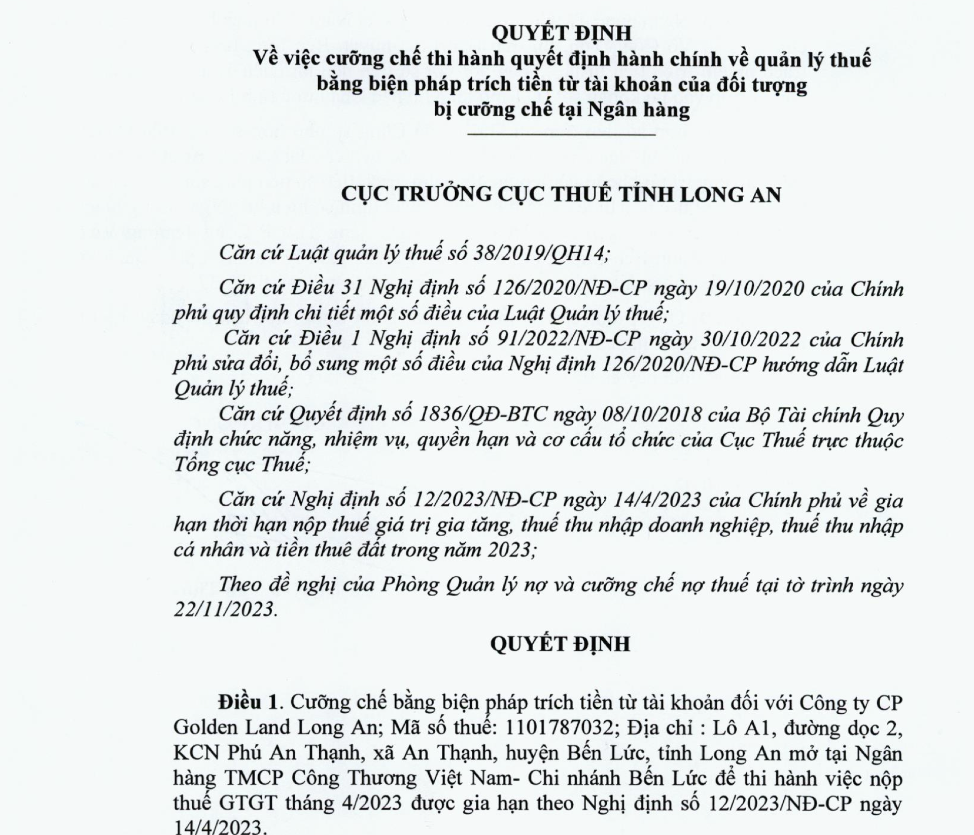 Căn cứ Luật Quản lý thuế, các quy định của pháp luật, Cục Thuế tỉnh Long An quyết định cưỡng chế bằng biện pháp trích tiền từ tài khoản đối với Công ty cổ phần Golden Land Long An.