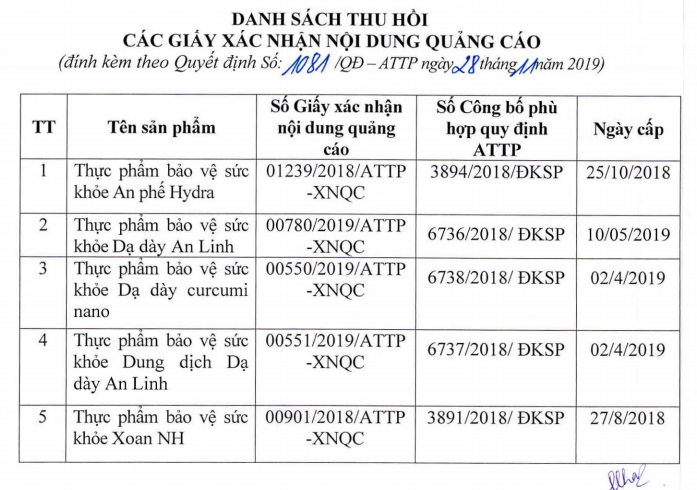 Sau đó, Cục An toàn thực phẩm tiếp tục ban hành các quyết định số 1060/QĐ-ATTP ngày 22/11/2019và quyết định số 1081/QĐ-ATTP ngày 28/11/2019 về việc thu hồi hiệu lực Giấy xác nhận nội dung quảng cáo đối với các sản phẩm của Công ty Dreamt Life Việt Nam.