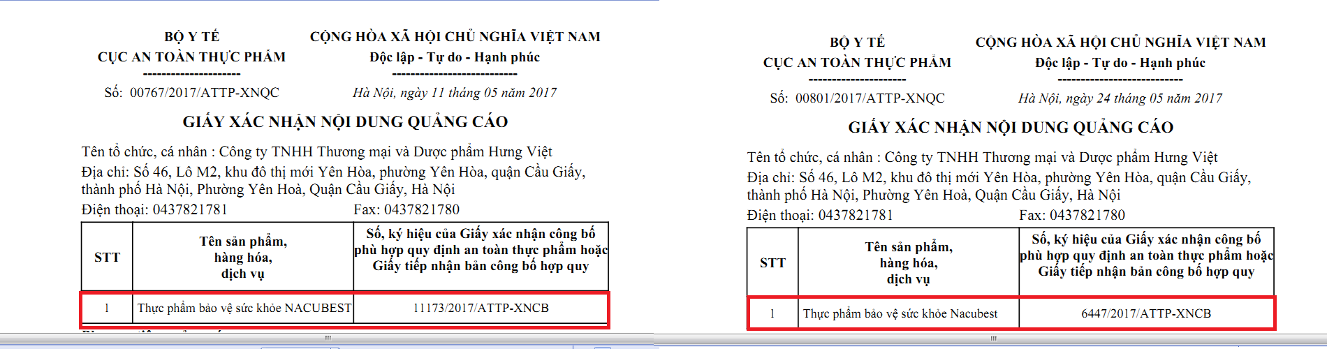 Mỏi mắt tìm trên maket quảng cáo sản phẩm Thực phẩm bảo vệ sức khỏe NACUBEST được Cục An toàn thực phẩm cấp cho Công ty TNHH Thương mại và Dược phẩm Hưng Việt tại Giấy xác nhận nội dung quảng cáo số 00767/2017/ATTP-XNQC ngày 11 tháng 05 năm 2017 thì nội dung quảng cáo sản phẩm thiếu hẳn nội dung cảnh báo: “Thực phẩm này không phải là thuốc, không có tác dụng thay thế thuốc chữa bệnh”. Không hiểu đây có là sự cố ý của doanh nghiệp khi đăng ký quảng cáo hay không và nhằm mục đích gì?