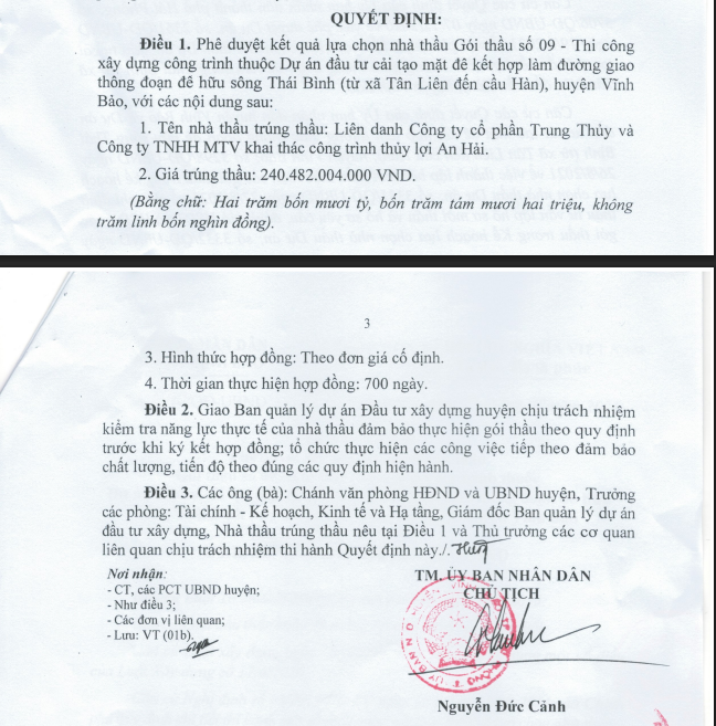 Đến ngày 23/12/2021, ông Nguyễn Đức Cảnh – Chủ tịch UBND huyện Vĩnh Bảo thời điểm đó đã ký quyết định 6070/QĐ-UBND phê duyệt cho liên danh của CTCP Trung Thủy trúng gói thầu thi công xây dựng công trình, thuộc Dự án Đầu tư cải tạo mặt đê kết hợp làm đường giao thông đoạn đê hữu sông Thái Bình (từ xã Tân Liên đến cầu Hàn), huyện Vĩnh Bảo.