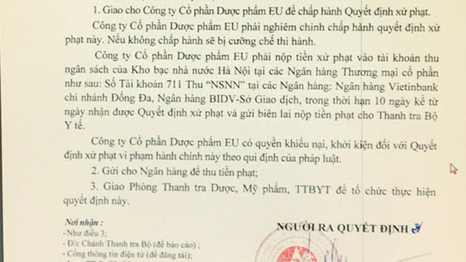 Với hành vi trên, Công ty CP dược phẩm EU do bà Nguyễn Thị Kim Chung làm giám đốc bị Thanh tra Bộ Y tế xử phạt với số tiền là 30 triệu đồng.