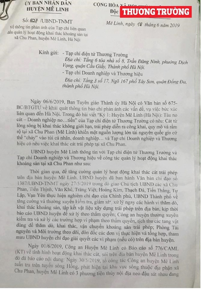 Đây là băn khoăn của nhiều người dân xã Chu Phan (Mê Linh, TP Hà Nội) gửi đến Thương Trường về tình trạng khai thác cát tại khu vực bến đò Chu Phan cùng buổi kiểm tra của Công an huyện Mê Linh (TP Hà Nội) ngày 30/5/2019 có nhiều vấn đề mập mờ, không hợp lý. | Sau khi Thương Trường có bài viết phản ánh về tình trạng khai thác cát trái phép tại xã Chu Phan (Mê Linh, Hà Nội), UBND huyện Mê Linh đã có công văn phúc đáp số: 1627/UBND-TNMT ngày 18/6/2019 do Phó Chủ tịch UBND huyện Mê Linh Trần Thanh Hoài ký. Tuy nhiên, công văn trả lời dấu hiệu né thông tin, thậm chí phủ nhận phản ánh của Thương Trường là không đúng. |