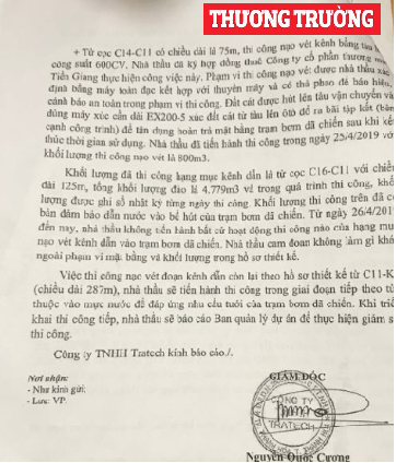 Theo một nguồn tin riêng của PV, ngày 6/6/2019 hợp đồng nạo vét kênh dẫn vào trạm bơm dã chiến của Công ty CP Thương mại Tiền Giang đã được nhà thầu thi công thanh lý với số tiền 57 triệu đồng.