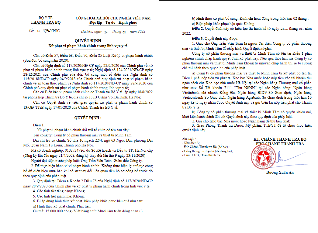 Cùng ngày, Thanh tra Bộ Y tế cũng ra quyết định xử phạt vi phạm hành chính trong lĩnh vực y tế đối với Công ty CP thương mại và thiết bị Minh Tâm (địa chỉ trụ sở chính: Số nhà 10 ngách 22/4, ngõ 63 Ngọc Đại, phường Đại Mỗ, quận Nam Từ Liêm, Hà Nội).