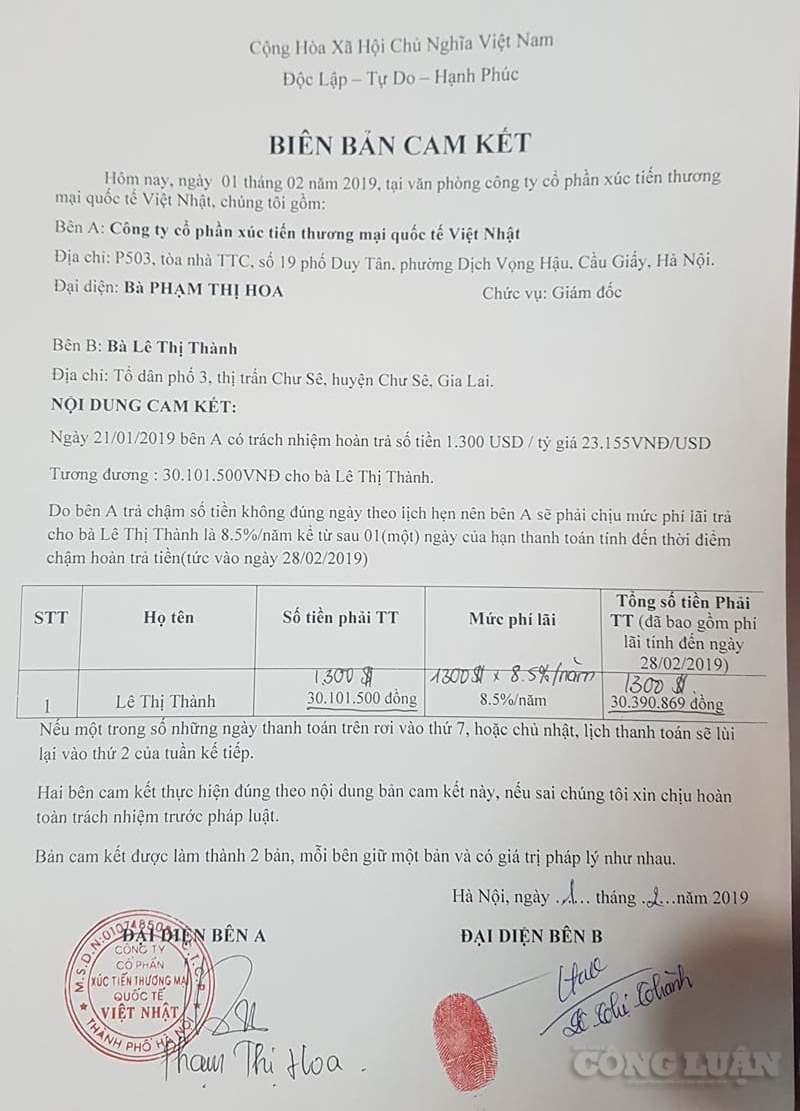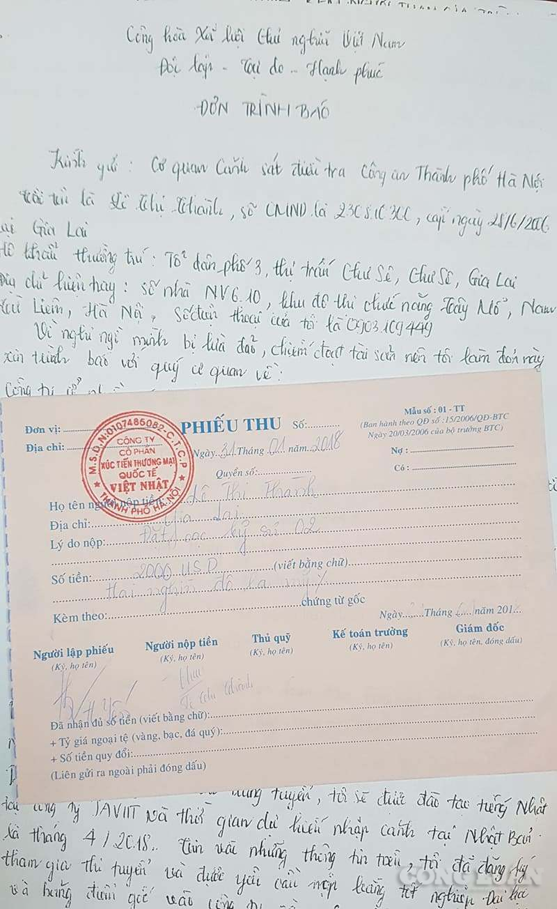 Đơn gửi Báo Nhà báo và Công luận, chị Lê Thị Thành, trú tại tổ dân phố 3, thị trấn Chư Sê, huyện Chư Sê, tỉnh Gia Lai cho biết: "Vào tháng 01 năm 2018, qua tìm hiểu trên mạng xã hội tôi được biết Giám đốc công ty JAVIIT là bà Phạm Thị Hoa ra thông báo rằng đơn vị đang tổ chức thi tuyển người lao động sang Nhật Bản làm việc với mức phí 7.000 USD. Theo thông báo, sau khi trúng tuyển đơn hàng, người lao động sẽ được đào tạo tiếng Nhật tại trung tâm của Công ty JAVIIT và thời gian dự kiến nhập cảnh tại Nhật Bản là tháng 4 năm 2018 (tức sau 3 tháng).
